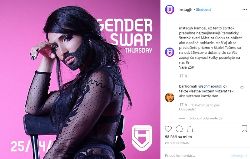 “Kamoši, už tento štvrtok prebehne najzaujímavejší tematický štvrtok ever! Máte za úlohu obliecť sa ako opačné pohlavie, stačí, ak sa prezlečiete priamo v škole! Tešíme sa na odvážlivcov a dúfame, že sa vás zapojí čo najviac! Fotky posielajte na náš IG,” uvádza bilingválne gymnázium na svojej stránke na sociálnej sieti.