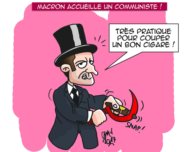 Len niekoľko hodín bolo súdené pobudnúť na sociálnej sieti Twitter karikatúre stvárňujúcej centristického kandidáta na úrad francúzskeho prezidenta Emmanuela Macrona. Kresba, ktorú zverejnila Republikánska strana (PR) ďalšieho adepta na Elyzejský palác Francoisa Fillona, zobrazila jeho soka so smelo zakrojeným nosom, zákerným miestoprísažným pohľadom pod príznačným cylindrom, v rukách držiaceho červený kosák a cigaru.