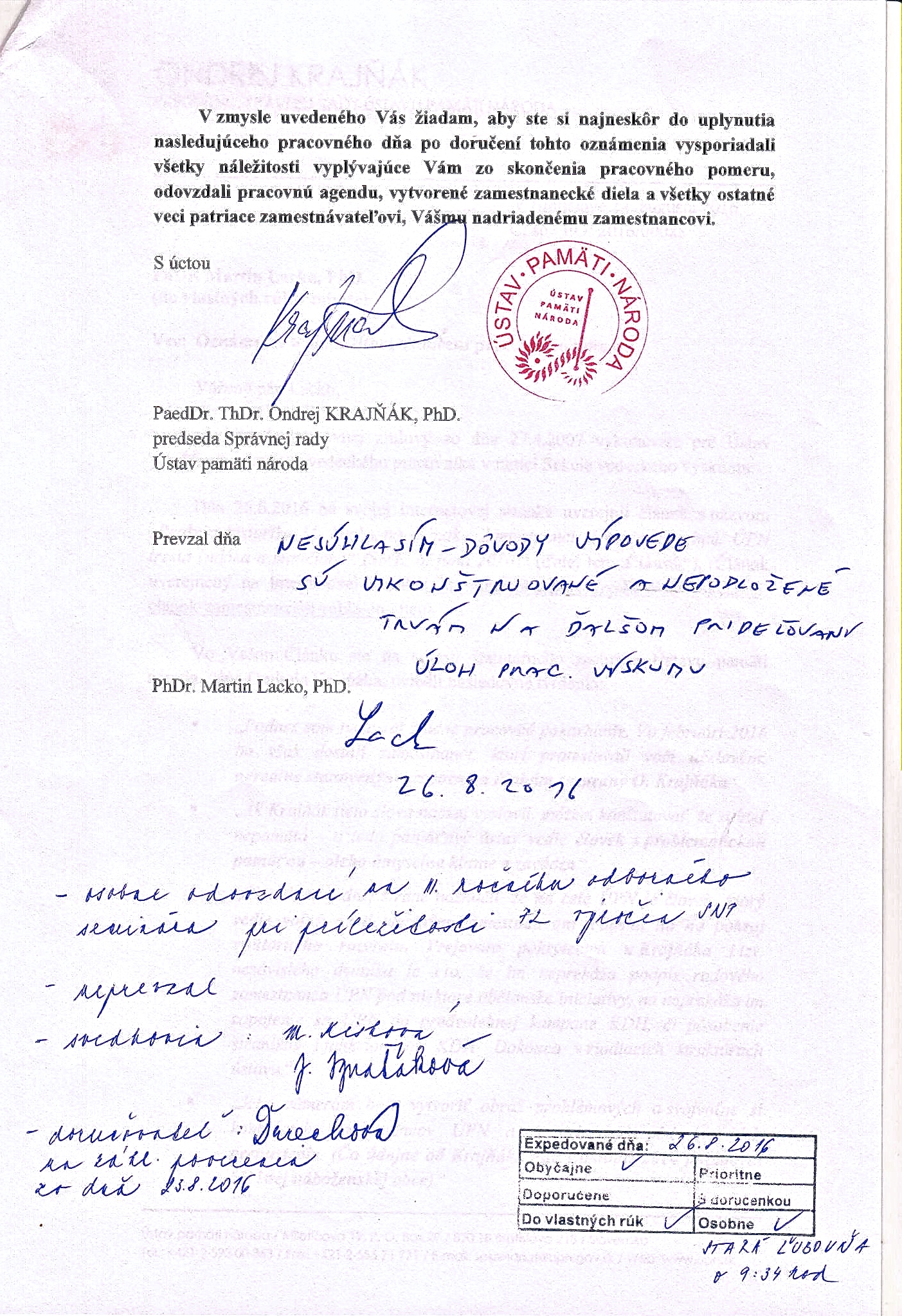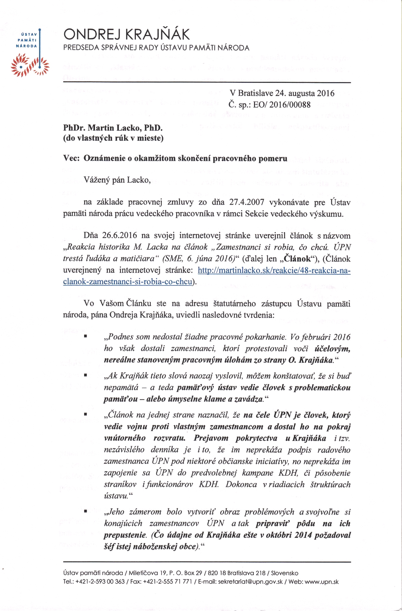 Lacko totiž v reakcii na osočujúci článok denníka SME, zrejme inšpirovaný samotným predsedom pamäťovej inštitúcie, uverejnil na svojej internetovej stránke kritiku Ondreja Krajňáka, ktorý „vedie vojnu proti vlastným zamestnancom a dostal ho na pokraj pracovného rozvratu.“ Pre štatutárneho zástupcu ÚPN to bola silná káva a nevedel ju prežrieť ináč, iba tak, že vyhodil z práce autora týchto aj iných, celkom odôvodnených kritických riadkov.