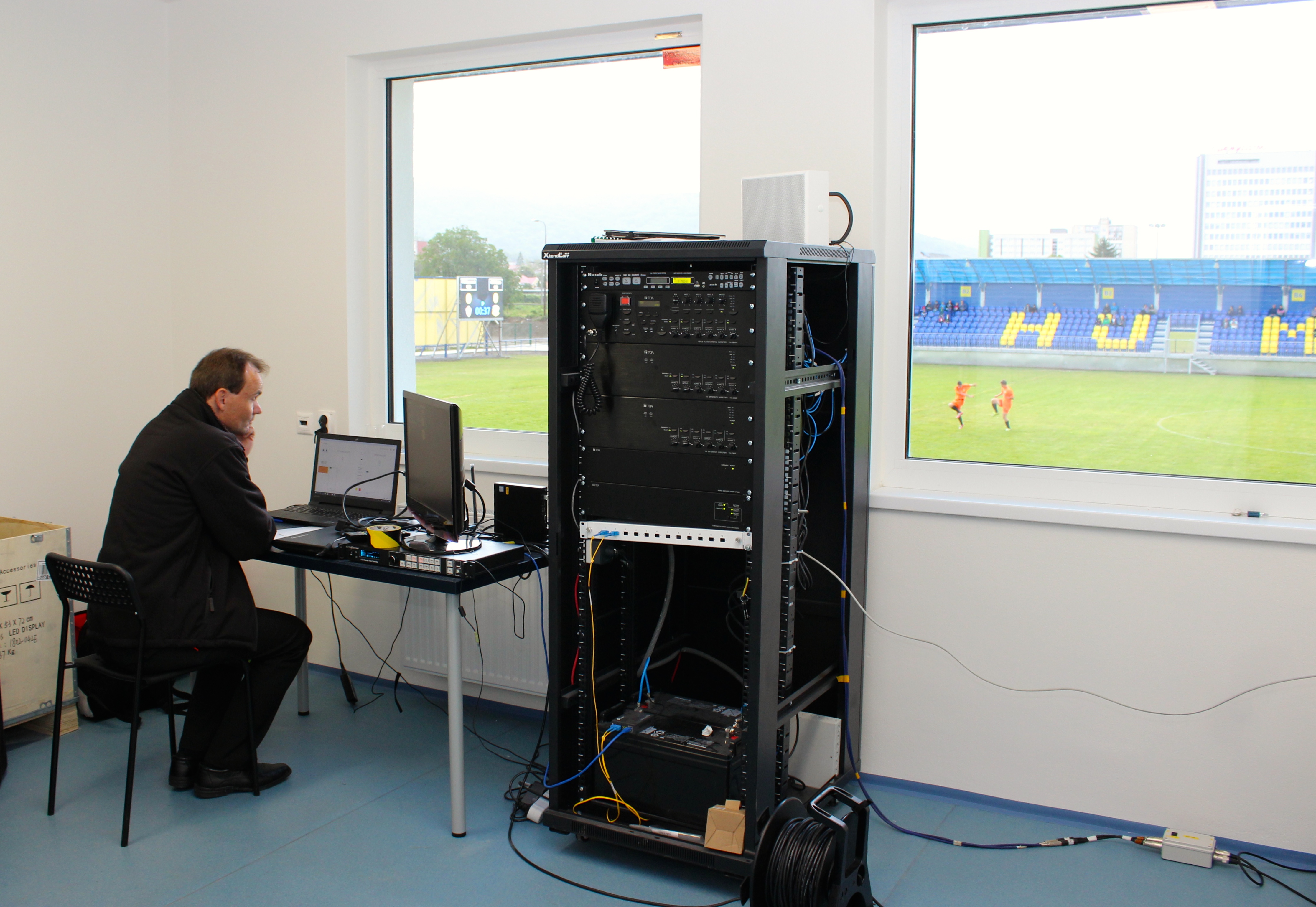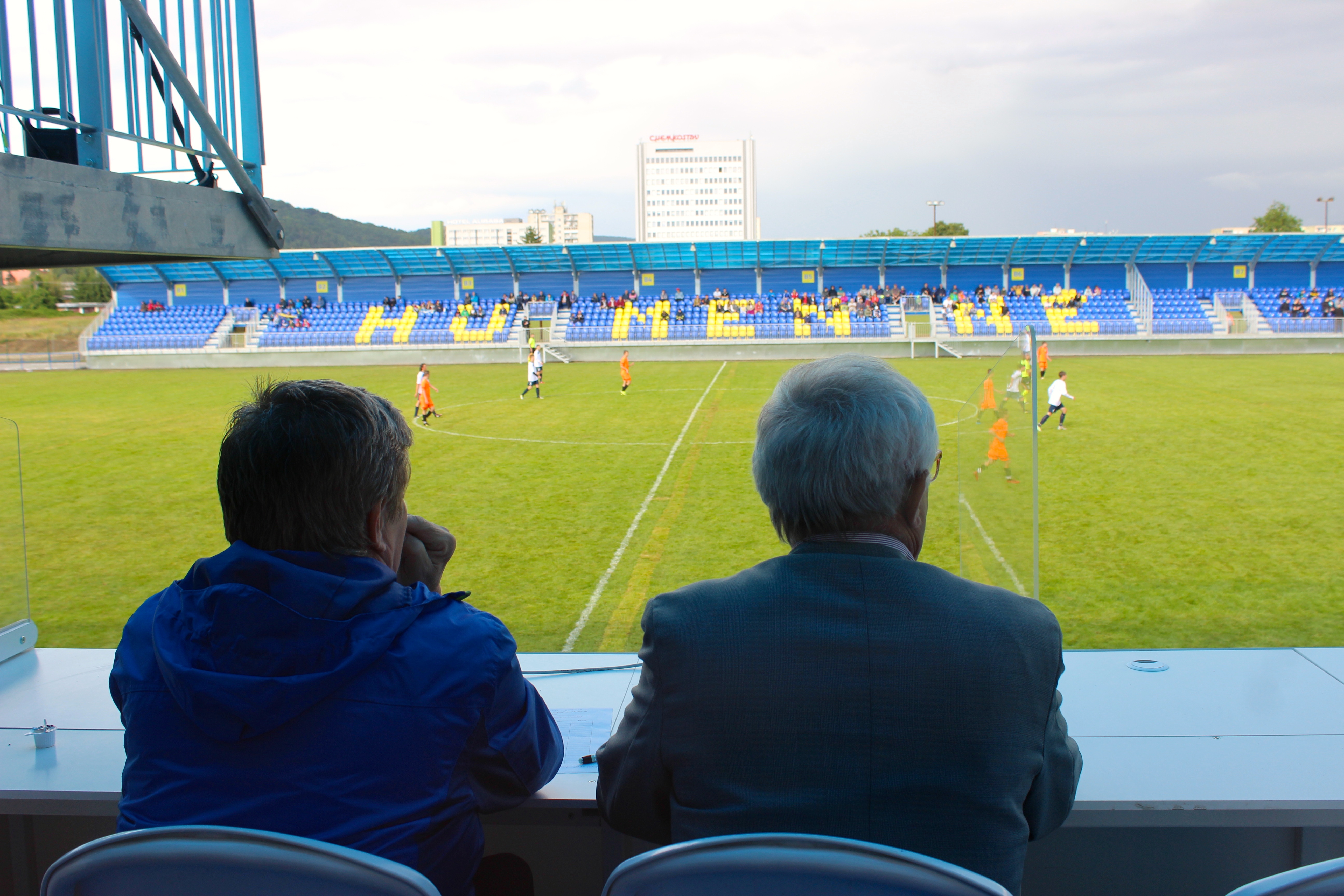 Na poschodí je miestnosť pre 50 novinárov s pripojením na Wi-Fi, je vybavená veľkoplošnou obrazovkou, výstup z miestnosti je priamo do sektoru novinárov, kde máme šesť komentátorských stanovíšť. Nájdete tu aj televíznu miestnosť s plošinou pre dve televízne kamery. Ďalej je tam velín na ozvučovanie štadióna a ovládanie veľkoplošnej obrazovky a svetelnej tabule. Takisto tu máme podľa podmienok SFZ VIP priestory s kuchynkou a sociálnymi zariadeniami a jednu prevádzkovú kanceláriu,” vyčerpávajúco nás informoval Rudolf Gregorovič.