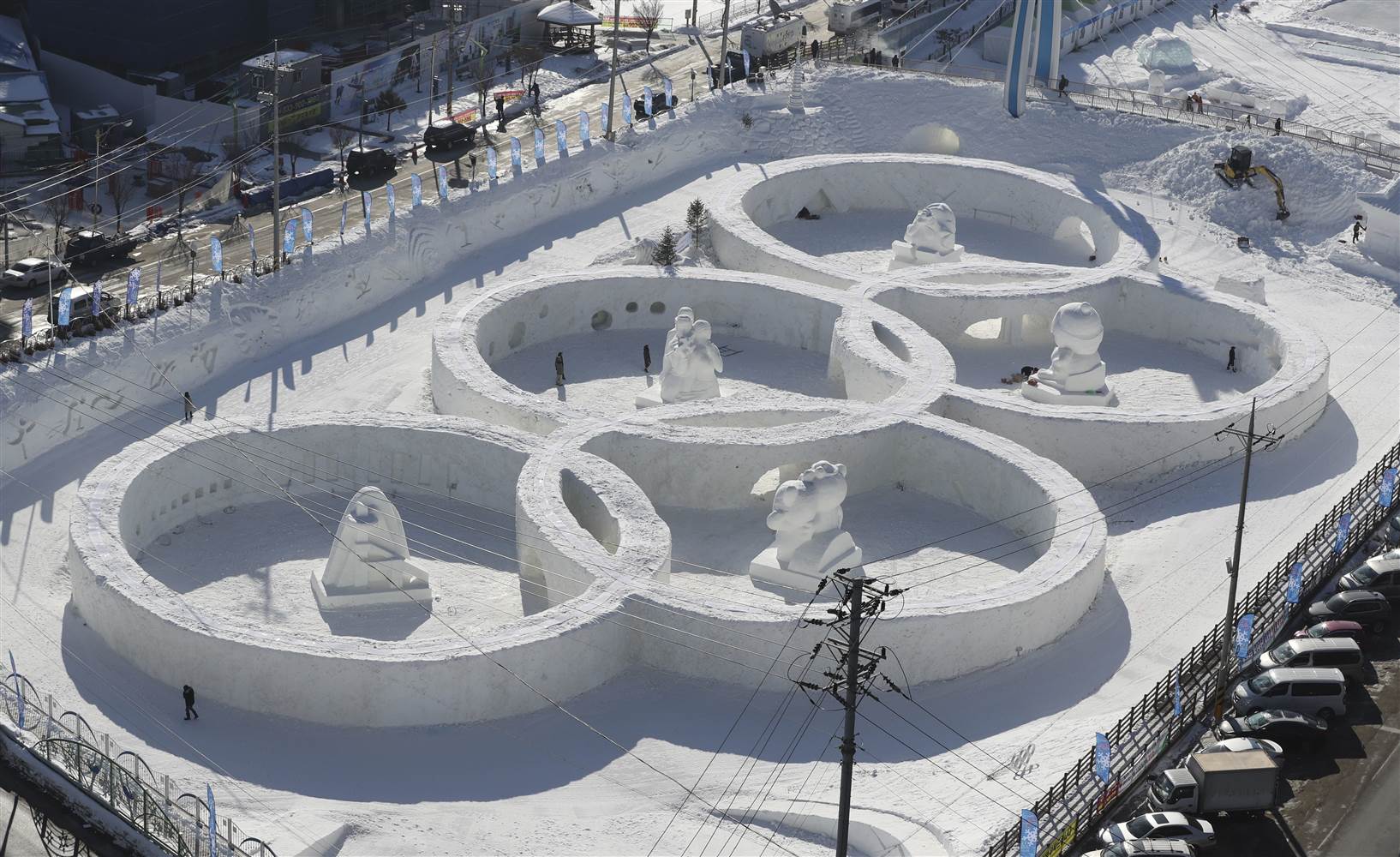 Asi najpôsobivejší záber z hier poskytne bobová dráha a skokanský mostík. Zhora vidno celý areál: reštaurácie, priestor pre médiá hneď vedľa koncertnej sály aj výškové budovy, predstavujúce olympijskú dedinu pre športovcov. Pri mori v neďalekom Kangnungu je pre športovcov na korčuliach pripravená rýchlokorčuliarska aréna, krasokorčuliarsky štadión aj hokejová hala.