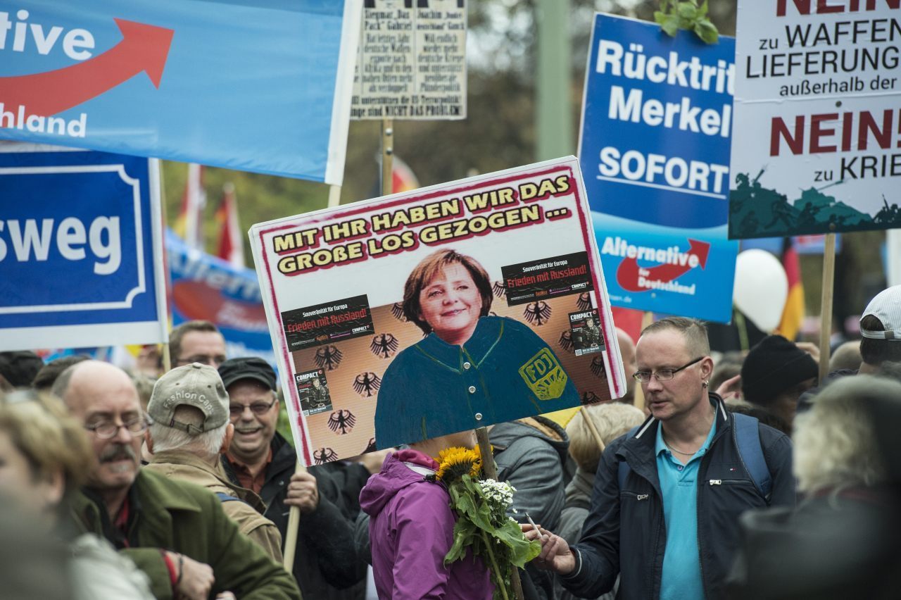 „Merkelová musí preč“, „Klamárka“, „Zradkyňa národa“ znelo so striedavou intenzitou z davu počas približne polhodinového prejavu šéfky nemeckého kabinetu. Skandovanie sprevádzal miestami ohlušujúci piskot, časté nadávky alebo zdvihnuté červené karty a prostredníky. Merkelová, ktorú silným potleskom podporovali jej priaznivci, sa protest snažila prekonať veľmi hlasným prejavom.