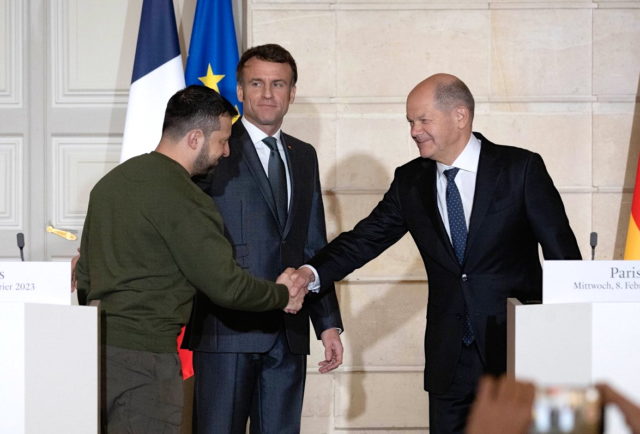 Vo francúzskej metropole sa stretol s prezidentom Emmanuelom Macronom a nemeckým kancelárom Olafom Scholzom. Macron pri tejto príležitosti prisľúbil, že Francúzsko pomôže Ukrajine vyhrať v boji proti ruskej armáde.