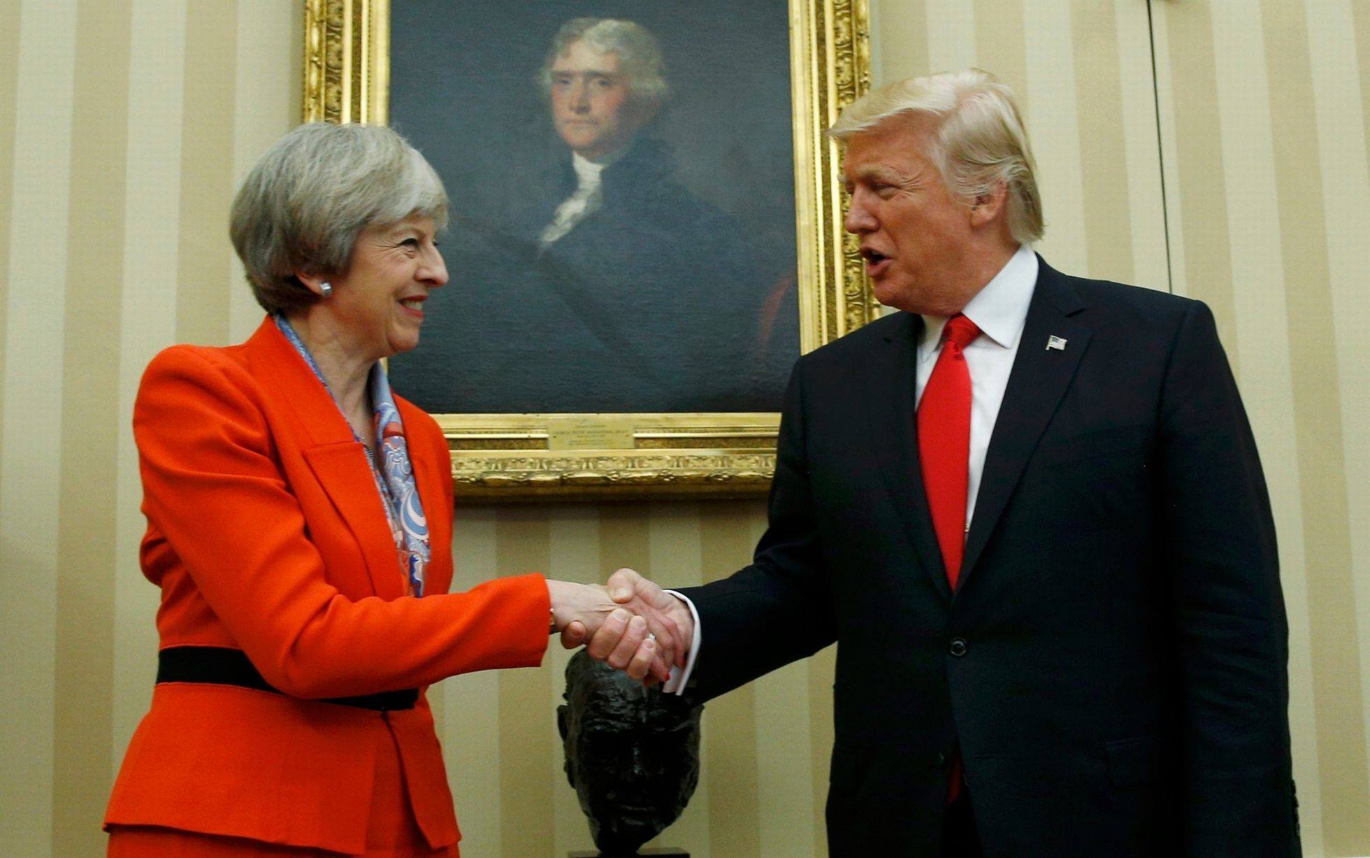 Spojené štáty americké a Spojené kráľovstvo musia podľa Mayovej prevziať medzinárodnú zodpovednosť a preukázať vodcovstvo. Podobné vojenské intervencie, aké sa odohrali v Iraku alebo v Afganistane, sa viac nesmú opakovať, zdôraznila. Mayová Trumpovi odovzdala v mene kráľovnej Alžbety II. pozvanie do Anglicka a americká hlava štátu ho prijala.