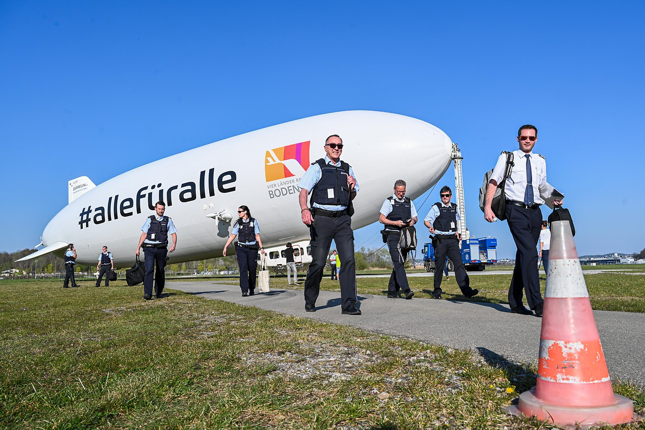 Nápis #allefüralle (Všetci za všetkých) má obyvateľov presvedčiť, aby napriek slnečnému počasiu zostali doma a pomohli tak zastavit šírenie koronavírusu SARS-CoV-2. Okolie Bodamského jazera je pritom so vzducholoďami úzko spojené. Práve v meste Friedrichshafen založil koncom 19. storočia gróf Friedrich von Zeppelin továreň na tento typ ovládateľného balóna.