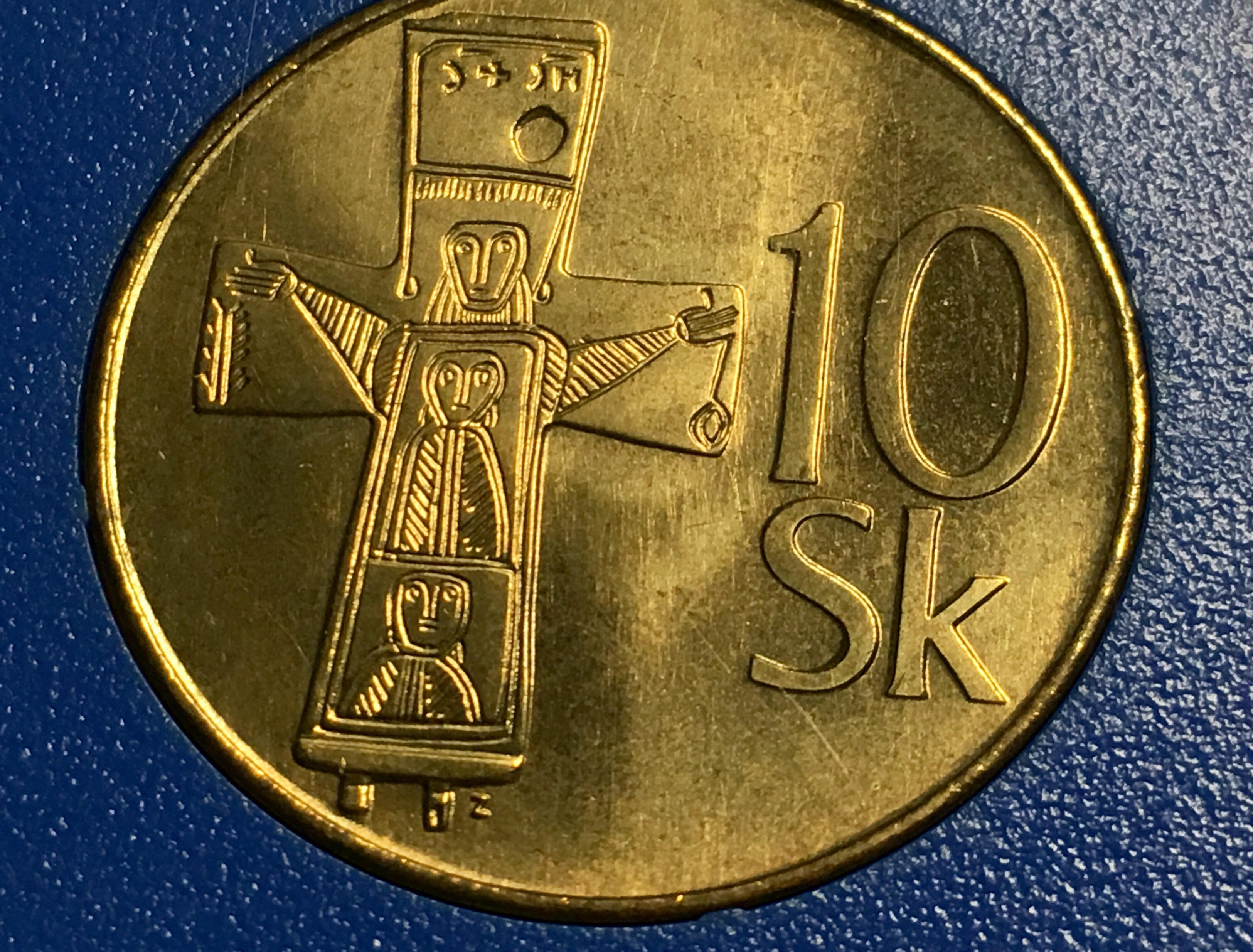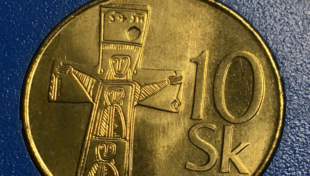 Prijal sa verdikt, že kým bankovky majú zobrazovať časť spísaných slovenských dejín, minciam pripadne úloha vyjadriť “archeologické” dejiny Slovenska. Preto bol na desaťkorunáčke, ktorú ako všetky ďalšie mince vyrazila mincovňa v Kremnici, krížik z 10. storočia so zrkadlovo opačným ISCHS, nájdený vo Veľkej Mači.