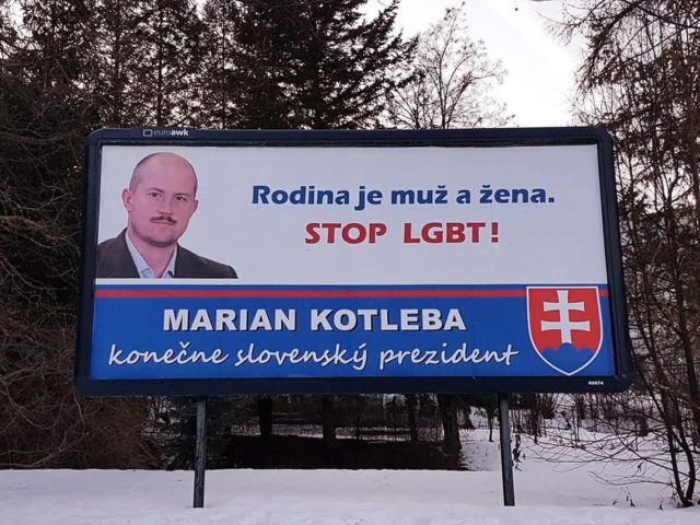 Mimovládne organizácie Inštitút ľudských práv, Slovak Political Watchdog a Dúhové Slovensko n.o podali trestné oznámenie na stranu ĽSNS a jej prezidentského kandidáta Mariana Kotlebu. Jeho predvolebné bilbordy s textom „Rodina je muž a žena. Stop LGBTI!” totiž vnímajú ako výzvu a diskrimináciu a porušovanie ľudských práv časti obyvateľov.