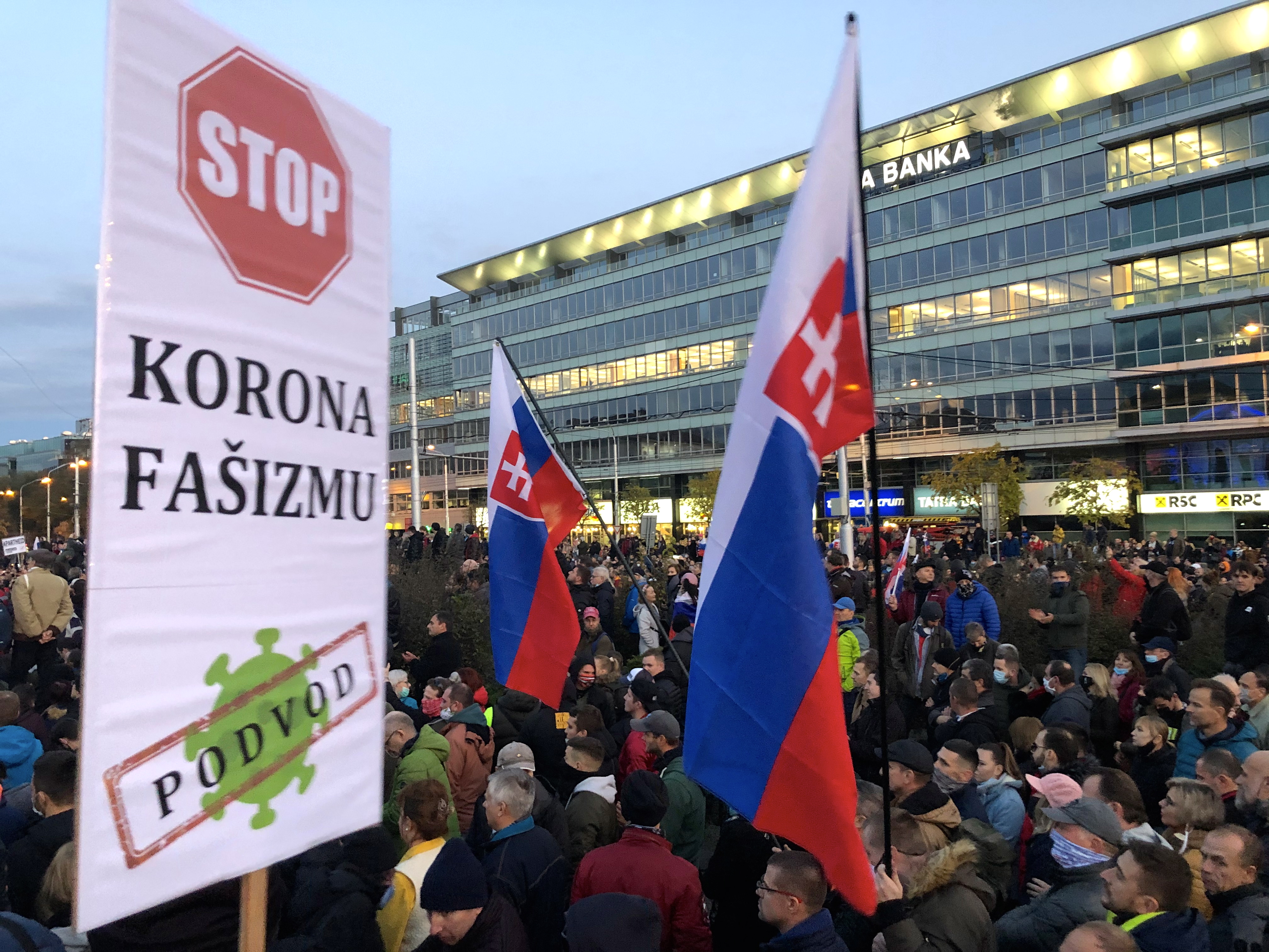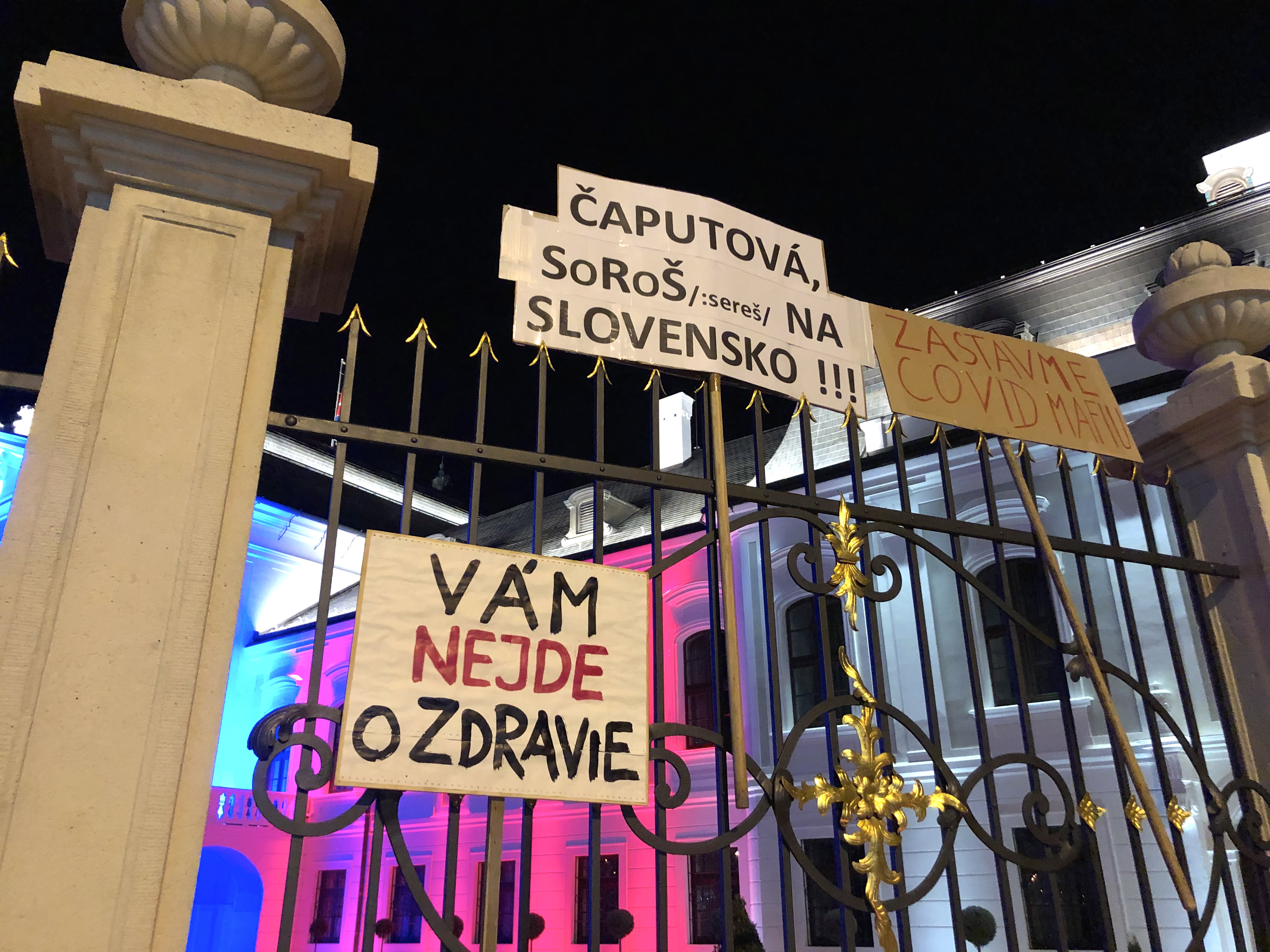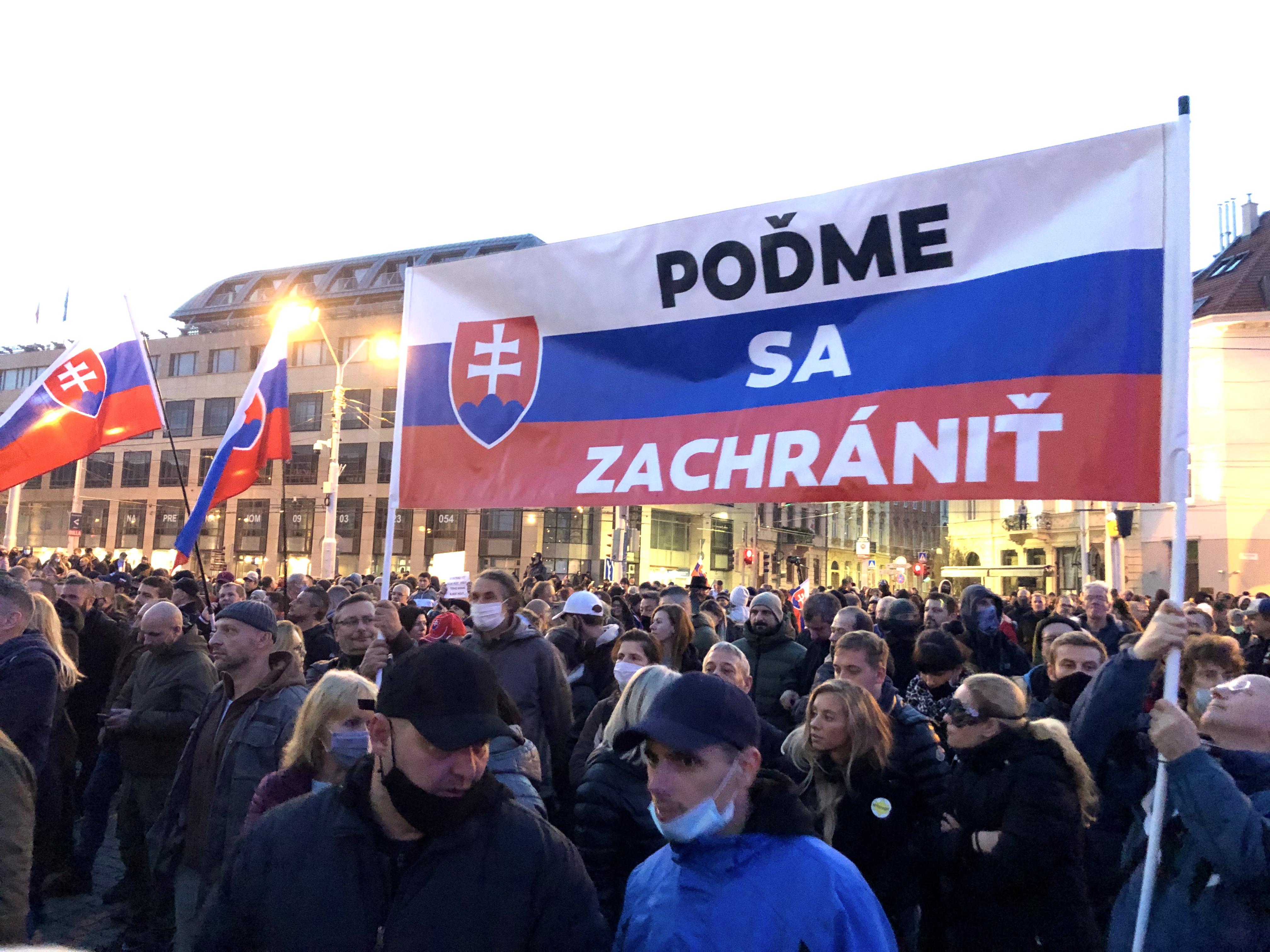 Ľudia kričali hanlivé heslá na adresu predsedu vlády, inokedy skandovali “Slobodu, slobodu!” Mnohí z prítomných držali transparenty s rôznymi nápismi – jeden z nich označoval pandémiu za podvod, ďalší prirovnával premiéra k Hitlerovi. Na kabátoch mali niektorí pripnutú židovskú hviezdu s nápisom “netestovaný”. Zhromaždení niekoľkokrát zaspievali slovenskú štátnu hymnu.