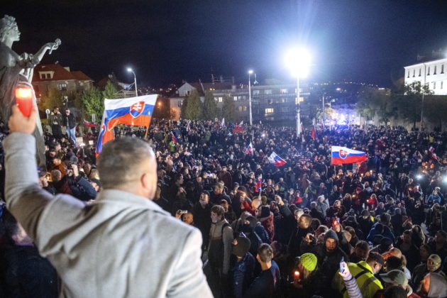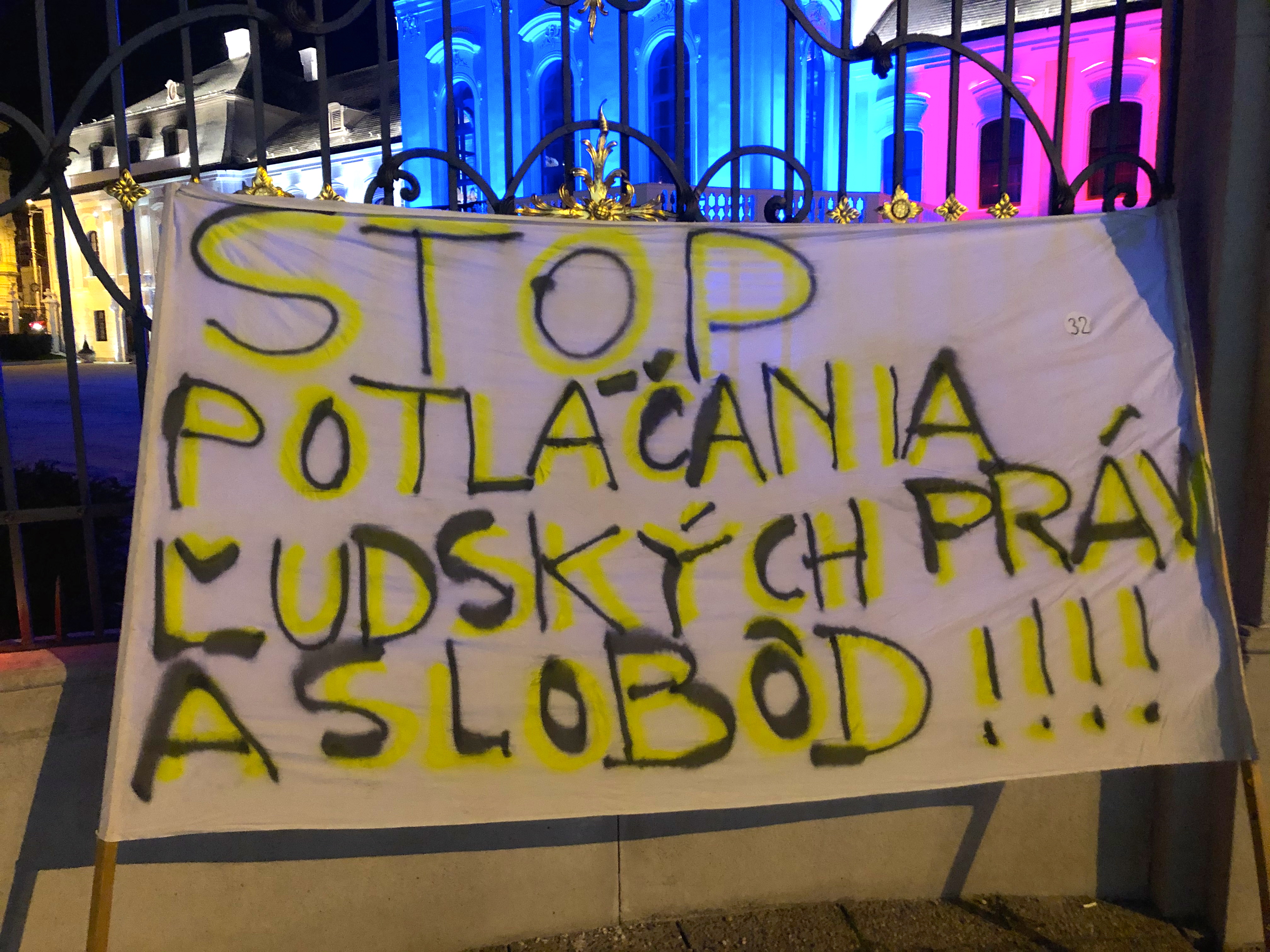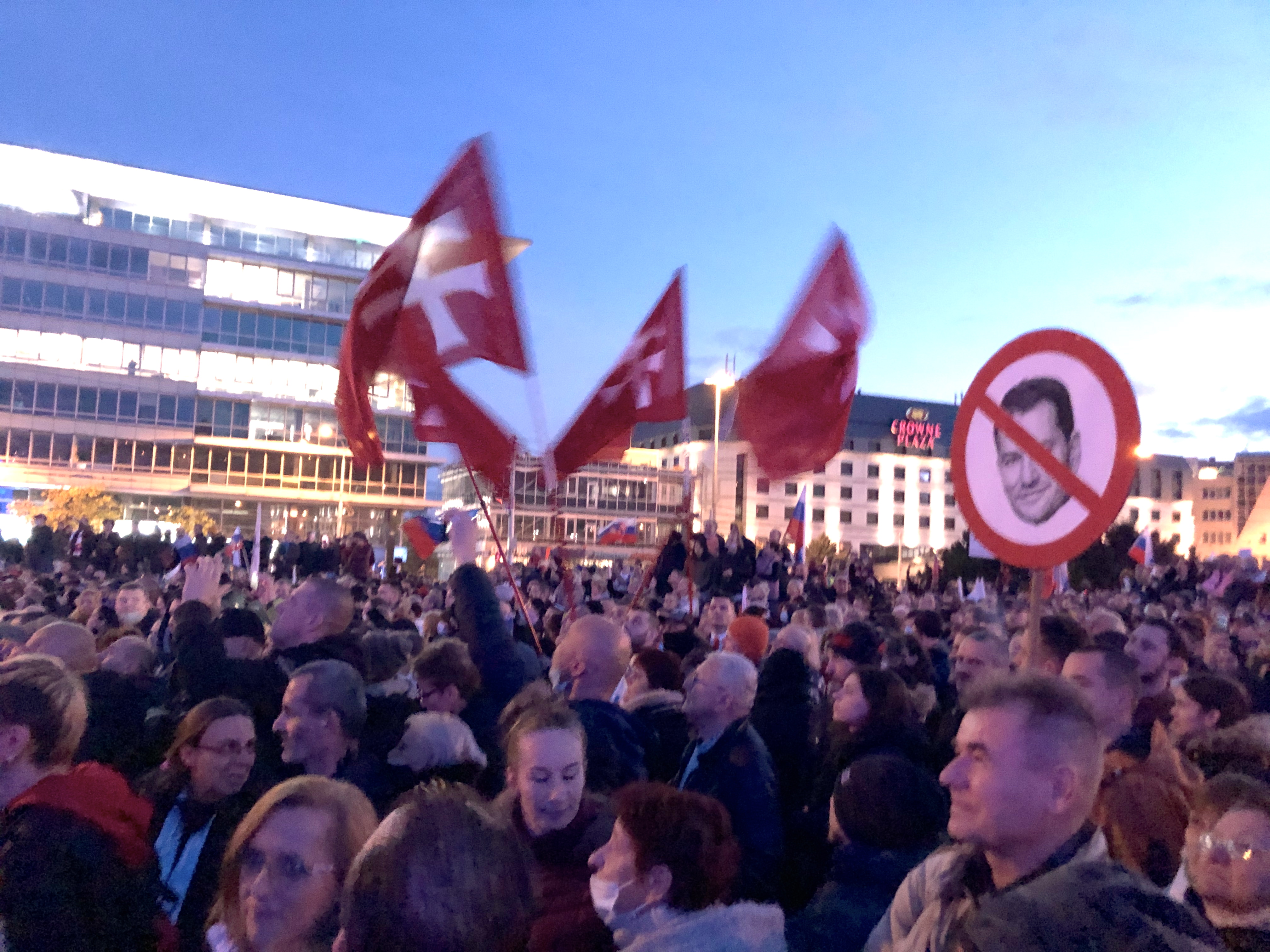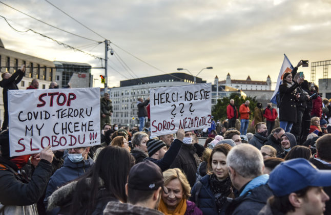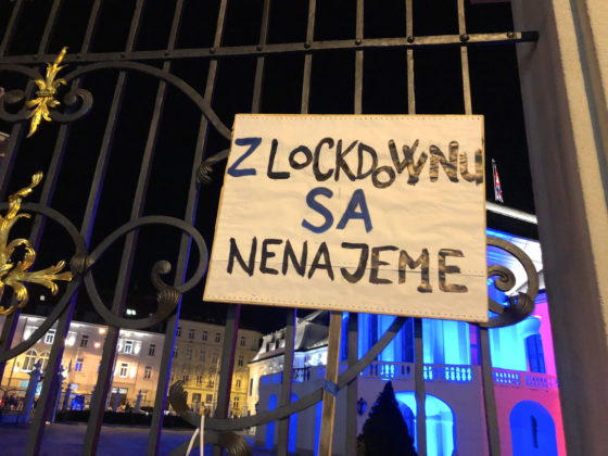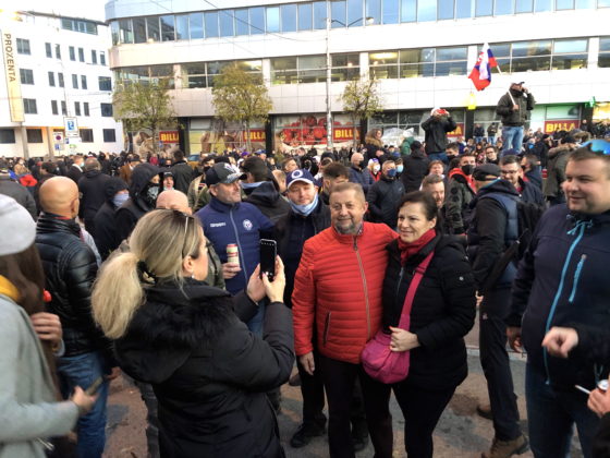 Ľudia kričali hanlivé heslá na adresu predsedu vlády, inokedy skandovali “Slobodu, slobodu!” Mnohí z prítomných držali transparenty s rôznymi nápismi – jeden z nich označoval pandémiu za podvod, ďalší prirovnával premiéra k Hitlerovi. Na kabátoch mali niektorí pripnutú židovskú hviezdu s nápisom “netestovaný”. Zhromaždení niekoľkokrát zaspievali slovenskú štátnu hymnu.