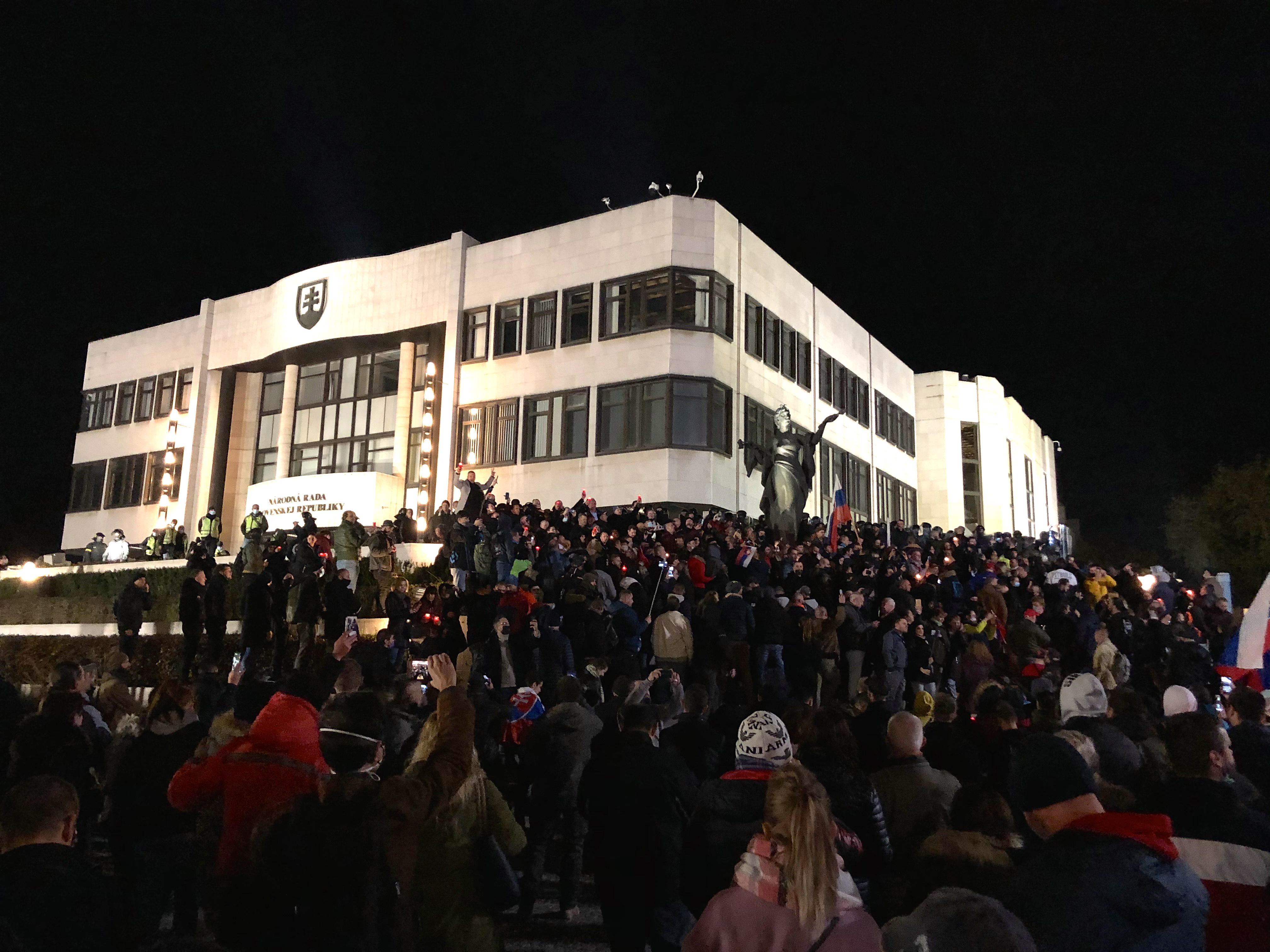 Následne blízku Mudroňovu ulicu zaplavil niekoľkotisícový dav ľudí, kráčajúci smerom na Vodný vrch. Ľudia sa zhromaždili na námestí a priľahlom priestranstve pred parlamentom. Na schodisku dav tesne pri budove zastavili ťažkoodenci. Po pokriku “Prilby dole!” si policajti na chvíľu symbolicky prilby zložili, aby ukázali, že nechcú proti ľuďom zasiahnuť. Dav na to reagoval veľkým potleskom a skandovaním “Ďakujeme! Ďakujeme!”.
