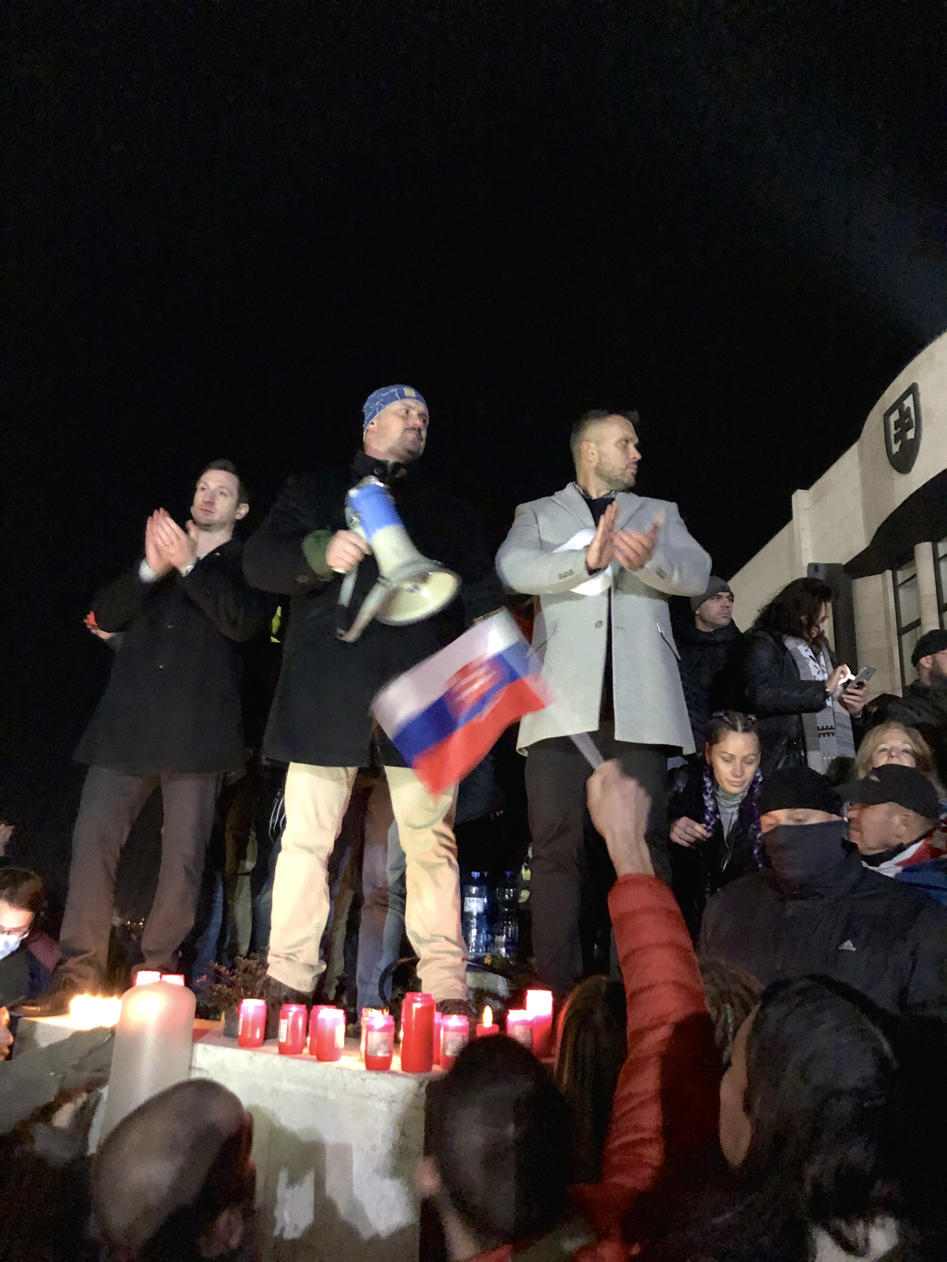 Z priestoru nad schodiskom sa davu začali prostredníctvom megafónu prihovárať predstavitelia ĽSNS. Marian Kotleba vyzval ľudí, aby mali pochopenie pre prítomných policatov, ktorí musia plniť príkazy a nemôžu za to, kto dnes ovláda ministerstvo vnútra a políciu. Dodal, že pokojný protest bez provokácií a násilností, ale s jasným vyjadrením svojho názoru má zmysel.