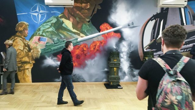 Výstava je venovaná dejinám NATO a otvára ju bombardovanie japonských miest Hirošima a Nagasaki Spojenými štátmi v roku 1945. Vymenúva tiež bombardovania Juhoslávie v roku 1999, vojny v Iraku, Vietname a Afganistane a takisto vzťah NATO s Ukrajinou, ktorý podľa múzea „viedol až k terajšiemu konfliktu“.