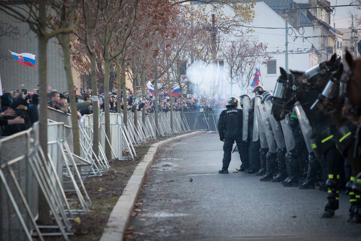 “Príslušníci poriadkových jednotiek počas zhromaždenia odvracali rukami a obrannými štítmi pyrotechnické predmety, ktoré boli zo strany zúčastnených osôb hodené proti nim. Zásahové výbušky zo strany policajtov poriadkových jednotiek neboli použité.
